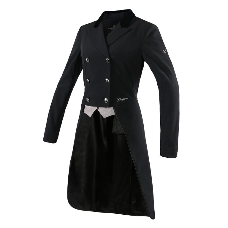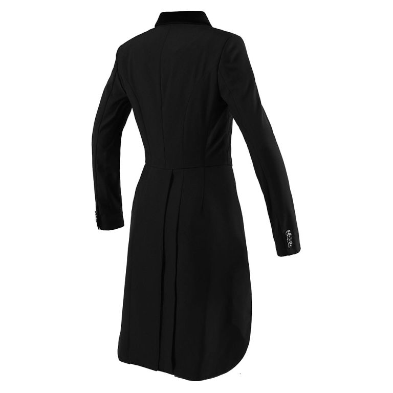 Turnierfrack INDIANAPOLIS aus Softshell für Damen Turnierfrack aus Softshell, verziert mit Paspeln. Wasserabweisend und atmungsaktiv. KLD-Knöpfe sowie Metallkreuz am linken Ärmel. Im Lieferumfang enthalten: Frackspitzen in Silber, Beige und Rot. 94% POLYESTER 6% ELASTHANE (SPANDEX)