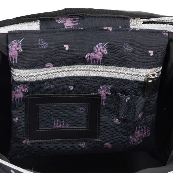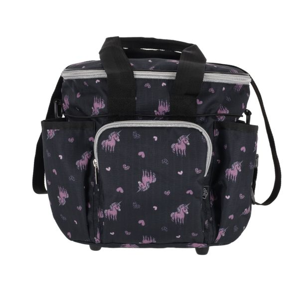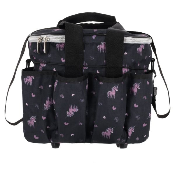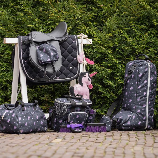 Diese Putztasche aus der Kollektion Lize hat mehrere Fächer und ist mit einem Reißverschluss verschließbar. Innenliegende Reißverschlusstasche mit transparentem Ausweisfach und zwei Stiftschlaufen. Außen bieten mehrere Fächer Platz für Zubehör, etwa eine Wasserflasche oder ein Pflegespray für dein Pony. An der Vorderseite ist eine zusätzliche Reißverschlusstasche angebracht. Am Schultergurt und den Handgriffen lässt sich die Tasche praktisch mitnehmen.
