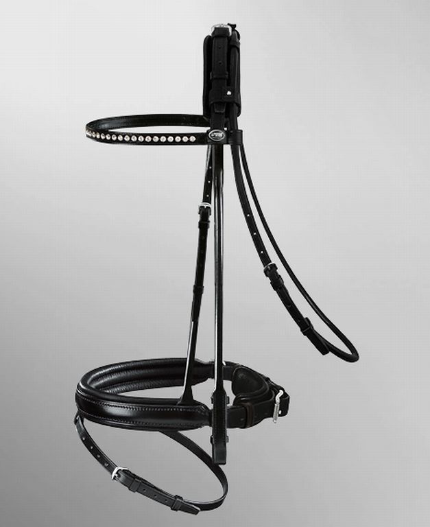 Die elegante, rund genähte Trense Neptune ist die perfekte Verbindung von Exklusivität und Schönheit. Sie hat einen Stirnriemen mit glitzernden, großen Strasssteinen und ein pferdefreundliches, weich unterfüttertes Passier Reithalfter Spezial mit Sperrriemen. Der Kehlriemen und die Seitenteile des Zaums sind aufwändig rund genäht. Durch die abnehmbare Kopfstrippenunterfütterung wird der Druck aufs Genick des Pferdes nachhaltig gemindert. Die edle Trense überzeugt durch ihre wunderschöne Optik und ihre exklusive Verarbeitung mit feinstem Passier Zaumleder und Edelstahlbeschlägen. Gurtzügel mit Lederstegen und Martingalschiebern zum Knöpfen erden mitgeliefert.