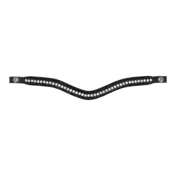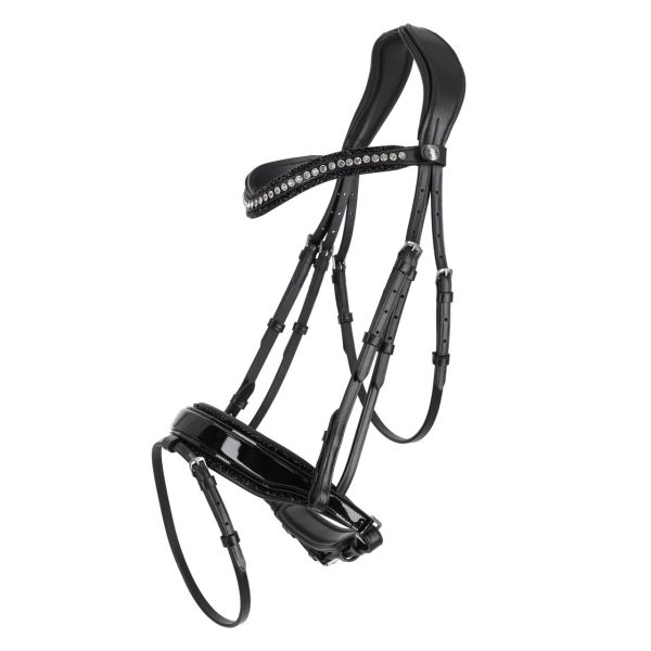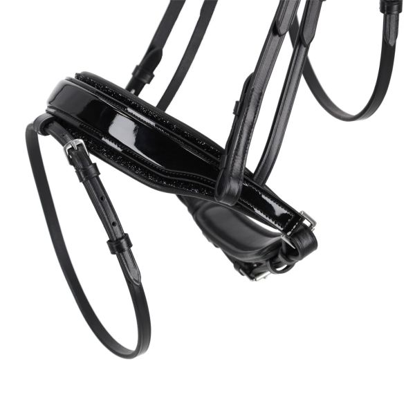 Anatomische Trense mit abnehmbarer Unterlage und auswechselbarem Stirnriemen. Die Nasenriemenunterlage mit Lack und Glitzerrand ist dank des Klettbands leicht abnehmbar. Der auswechselbare Stirnriemen mit Steinchen und Glitzerdetails wird mit Druckknöpfen befestigt. Das weiche, anatomisch geformte Genickstück mit Aussparung verringert den Druck auf das Nackenband.