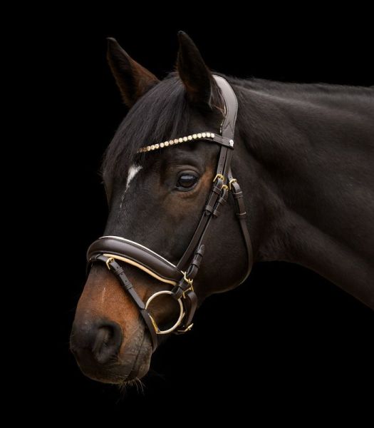 Neben der Funktionalität überzeugt die Trense auch optisch: Das geschwungene Stirnband und die edlen Messingbeschläge verleihen ihr eine elegante Ausstrahlung – ideal für Training und Turnier.