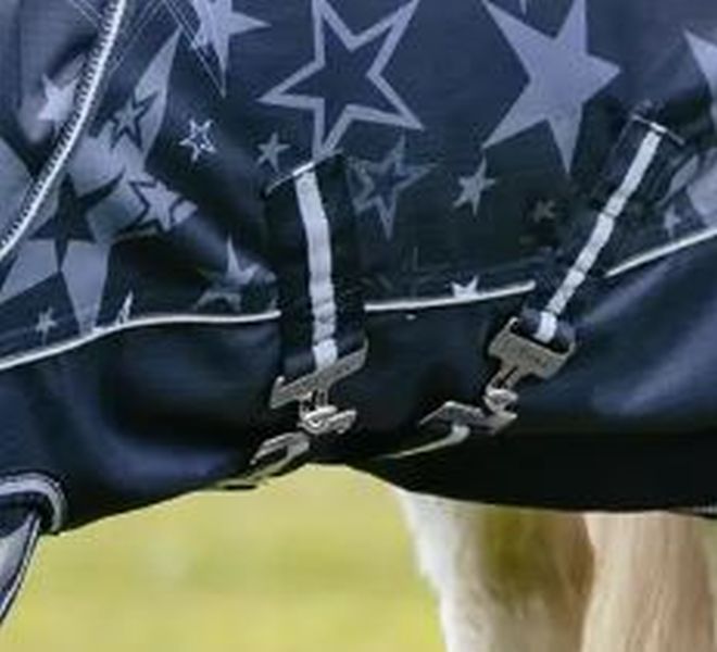 Hüllen Sie Ihren Liebling ein wie einen Superstar mit dieser fabelhaften wasserdichten Ripstop-Weidedecke mit Stern-Print. Dank des 600 Denier Ripstop-Außenmaterials ist sie robust und langlebig bei jedem Wetter. Sie ist bis 3 000 mm wasserdicht und verfügt über einen MVP-Wert von ebenfalls 3 000 für garantierten Komfort. Das antibakterielle, antistatische Schulterfutter sorgt für noch mehr Fellglanz, während verschiedene thermogebondete Füllgewichtsoptionen Ihnen jede Menge Flexibilität für unterschiedliche Wetterbedingungen bieten. Unser patentierter, um 45° abgewinkelter T-Frontverschluss und das geschützte, zweiteilige Frontdesign sorgen für Bewegungsfreiheit, während Ihr Pferd auf der Weide grast, galoppiert und sich wälzt. Alle hochwertigen Designdetails, die Sie von einer LeMieux Weidedecke erwarten, sind vorhanden: reflektierende Einfassungen, ein leicht zu reinigender, PVC-beschichteter Schweifriemen, robuste Kreuzgurte und elastische Beinschlaufen. Einmal aufgelegt, können Sie sicher sein, dass diese Decke nicht verrutscht! Kompatibel mit LeMieux Unterdecken für eine vollständige Temperaturregelung über alle Jahreszeiten hinweg.