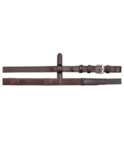 Das weiche Gummimaterial mit erhobenen Gummistegen sorgt für besonders guten Grip, selbst bei feuchten oder regnerischen Bedingungen. Die Struktur der Gummistege bietet eine ausgezeichnete Rutschfestigkeit, sodass die Zügel auch in stressigen Momenten sicher in der Hand bleiben, ohne dass sie unangenehm in der Hand liegen. Züge- und Handende aus hochwertigem Leder, mit Martingalstoppern.